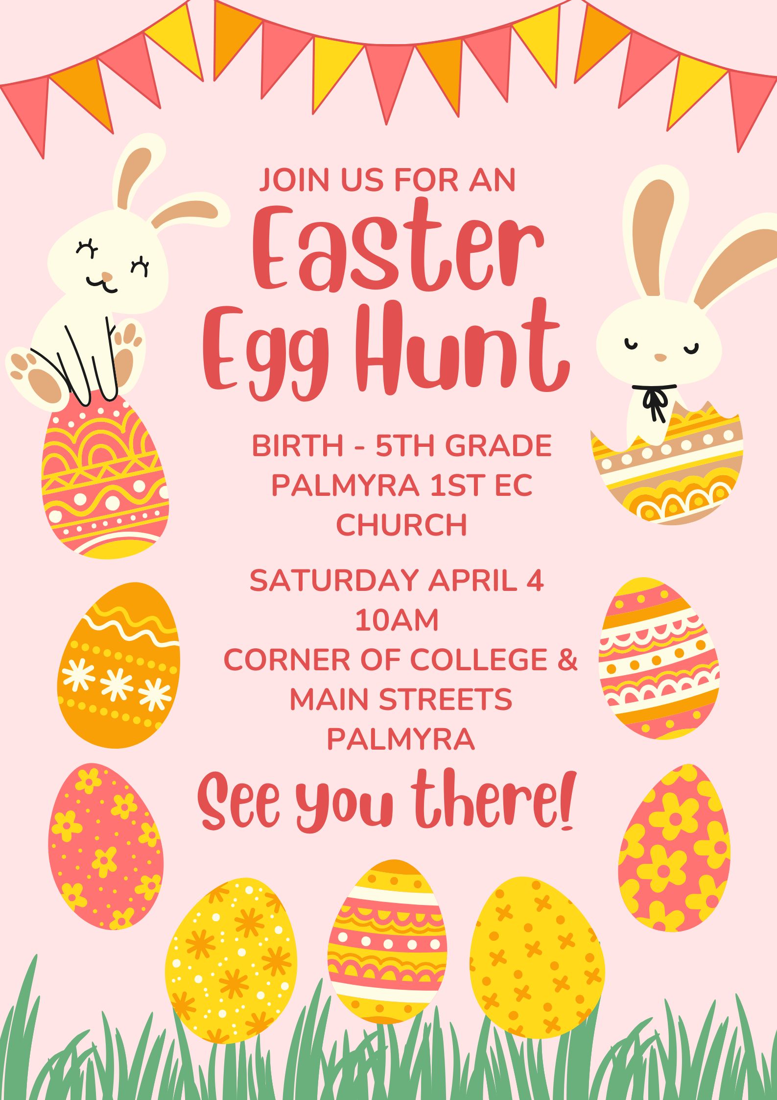 Bring the kids (birth-grade 5) to an Easter Egg Hunt at the Palmyra First EC Church on April 4, 2026 at 10:00 AM. See you there!